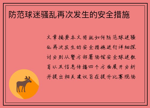 文章摘要: 本文将就如何防范球迷骚乱再次发生的安全措施进行详细探讨。分别从警方部署、场馆安全、球迷教育以及信息传播四个方面展开分析,并提出相关建议,旨在提升比赛现场秩序,确保球迷安全。1、警方部署警方...